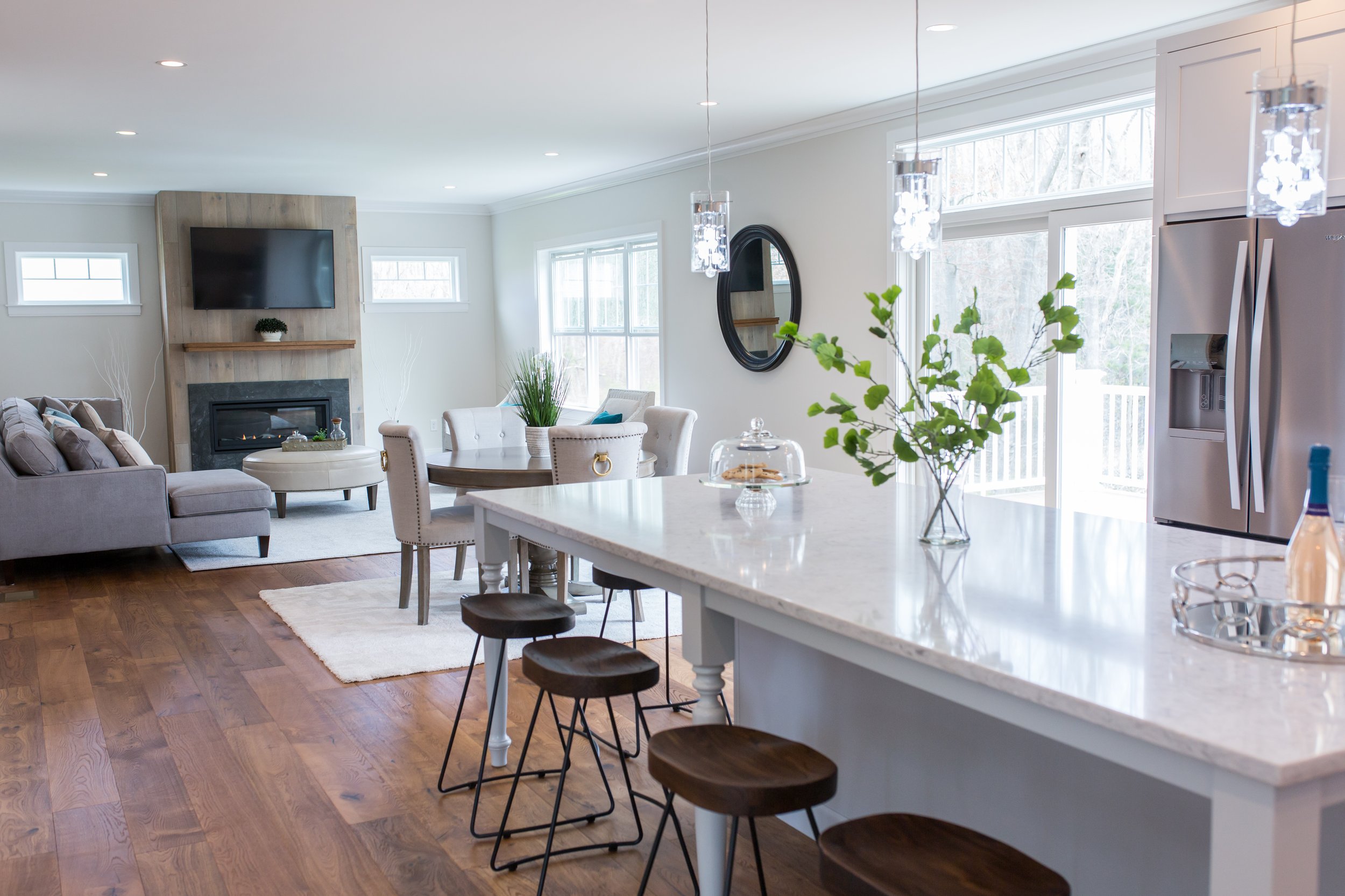 A custom six-person island anchors the space, complemented by stacked Shaker cabinetry, marble countertops, and a 36-inch range that creates a true chef’s kitchen. The open layout flows seamlessly along wide-plank flooring into the living area, where a gas fireplace with a wood-paneled accent wall adds warmth and architectural interest. Clean lines, natural materials, and generous ceiling heights bring a sense of openness while maintaining a refined, cohesive design.